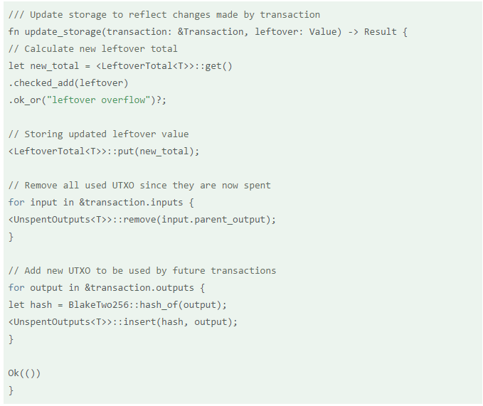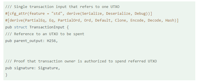 我们的实现与比特币之间的区别在于,我们直接通过其哈希值引用parent_output,而比特币则使用产生了UTXO的交易的哈希值以及一个索引来从交易输出列表中选择特定条目。原因是比特币是根据交易和区块定义的,而我们是根据业务逻辑和状态转换来定义的。在我们的例子中,Substrate事务只是辅助实体,它们促进了流程,并且大部分都超出了业务逻辑的范围。稍后再谈。