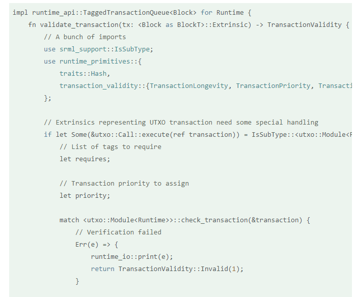 TaggedTransactionQueue API处理所有传入的外部消息,而不仅仅是我们的自定义UTXO事务。这为runtime提供了对外部验证过程的细粒度控制。例如runtime可能会执行其他检查,分配自定义优先级或简单地丢弃不需要的外部组件。