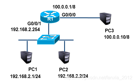 案例1:配置静态NAT,如图所示,在R1上配置静态NAT使192.168.2.1转换为100.0.0.2,192.168.2.2装换为10.0.0.3