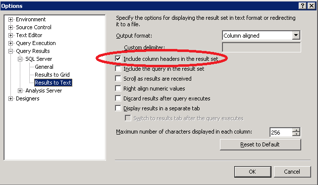 Tools --> Options, Select "Query Results" --> "SQL Server" --> "Results to Grid" and "Results to Text" (images below):