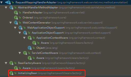 从层级结构看,主要实现了BeanFactoryAware、ApplicationContextAware、HandlerAdapter和InitializingBean。其他回调方法都是常规赋值,主要准备工作在afterPropertiesSet回调方法中完成。