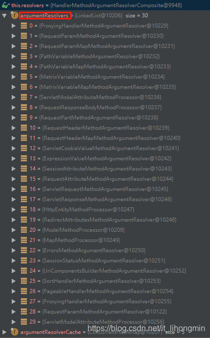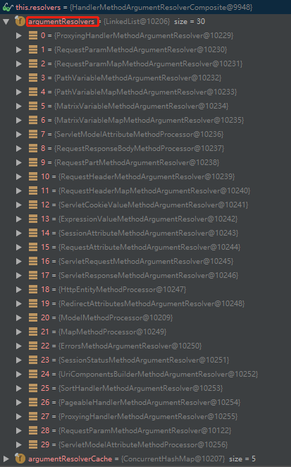 当前获取的MethodParameter为我们自己传入的方法调用参数,遍历该参数数组。每个参数再去遍历resolvers(HandlerMethodArgumentResolverComposite)中的HandlerMethodArgumentResolver去适配。其类型是上面afterPropertiesSet方法中初始化完成的。如下: