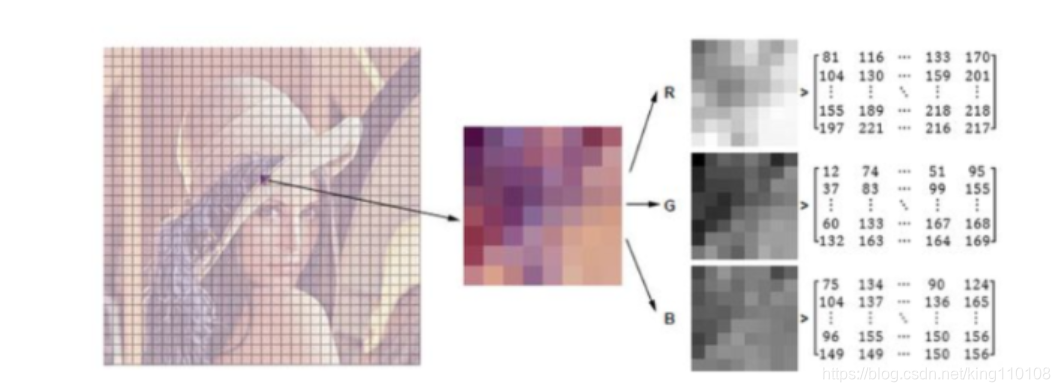 计算机中一个像素点事从0-255表示亮度,255最亮表示白色,0表示黑色。RGB是三维数据矩阵表示一个图片的所有像素点组成。