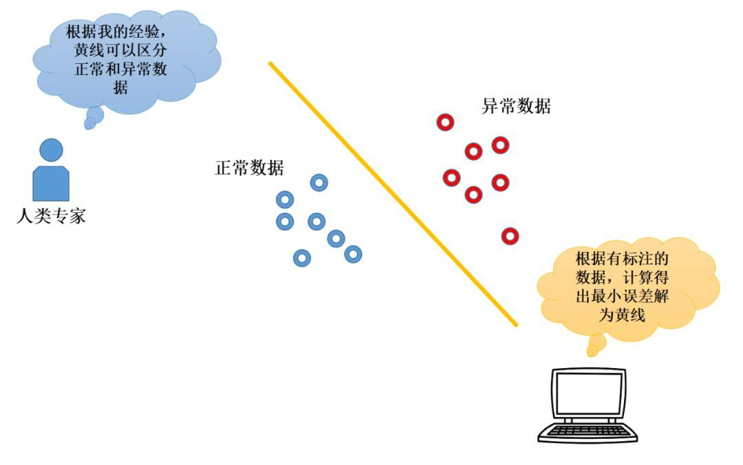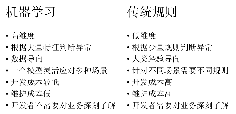 传统规则的异常检测,需要由对业务非常了解的专家来制定规则,这些规则往往是单个规则,或者寥寥几个规则结合定义异常。超高维度的规则需要考虑的情况非常多,人类并不具有精准处理高纬度规则的能力。相反,只要有足够多的准确标注的数据,机器学习模型可以轻易地在高纬度组合各种规则精准分类数据,不需要开发者对业务有绝对充足的经验。
