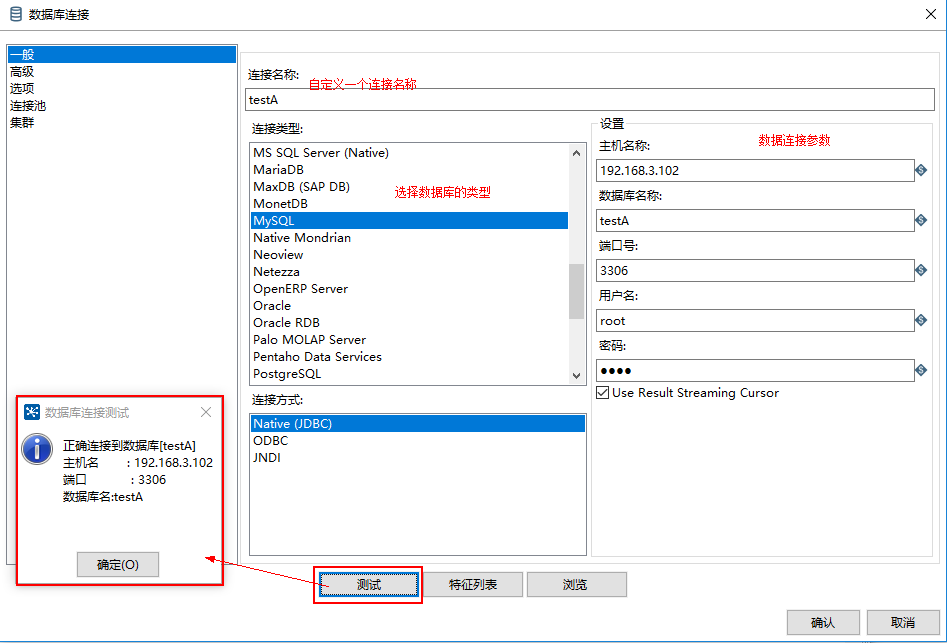 (1)步骤名称写入“user”,数据库连接选择我们user表所在的数据库,如果数据源未配置,可查看步骤2,进行配置。