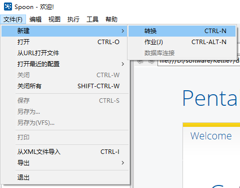 1、运行软件,进入主界面。点击左上角的 文件 → 新建 → 转换,新建一个转换,并保存,转换的后缀名为.ktr。