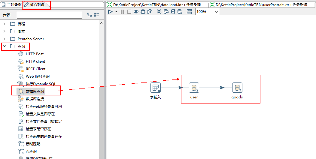 5、点击面板左侧的** 核心对象 ,选择 查询 ** 文件夹下的 ** 数据库查询 **,并把它拖到右侧的编辑区中,按住 shift 画线连接 “表输入”,如下图。