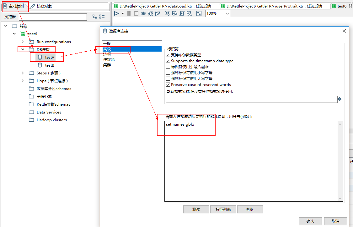 我们可以进入 主对象树 → DB连接 → testA(数据源) ** ,双击“testA”,选择“高级”,在下方输入 set names gbk;,设置编码格式为gbk(此处为我本地环境问题需要设置为gbk编码),根据实际情况设置编码格式。
