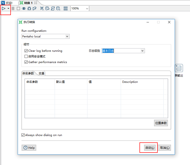 10、点击“运行这个转换”,选择“本地执行”,点击“启动”来执行这个转换。