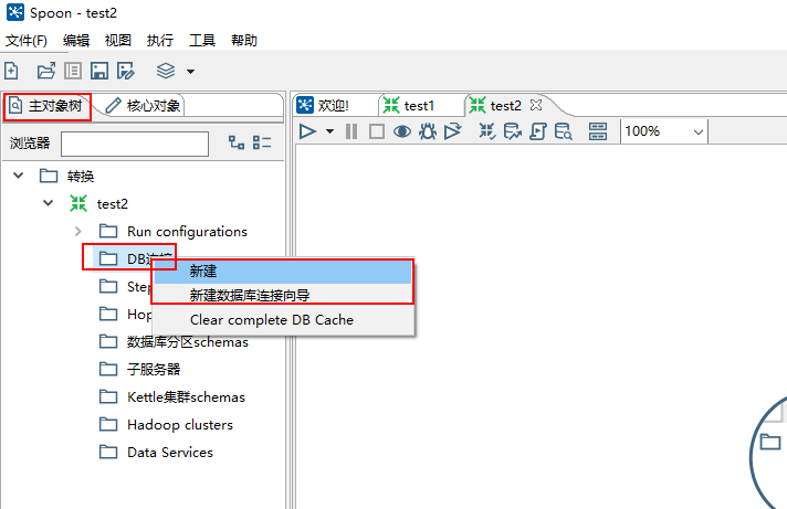 2、点击面板左侧的 主对象树 ,选择 DB连接 右键,选择 新建 或 新建数据库连接向导 分别创建对数据库A和数据库B的连接。