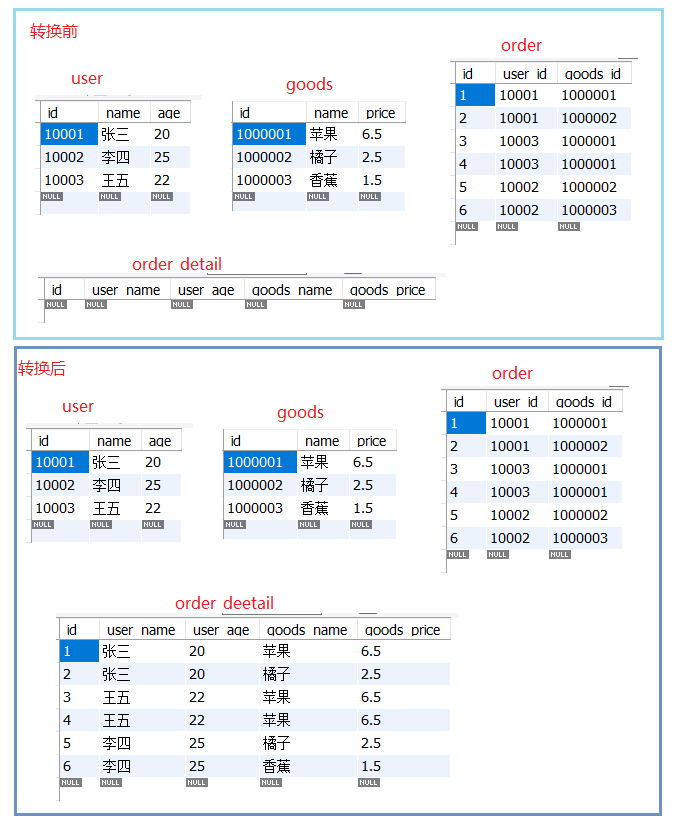 在数据库A中创建“用户表”、“商品表”、“订单表”,在数据库B中创建“订单详细信息表”。最终目标为根据用户表、商品表、订单表获取订单详细信息表,最终目标结果如下。