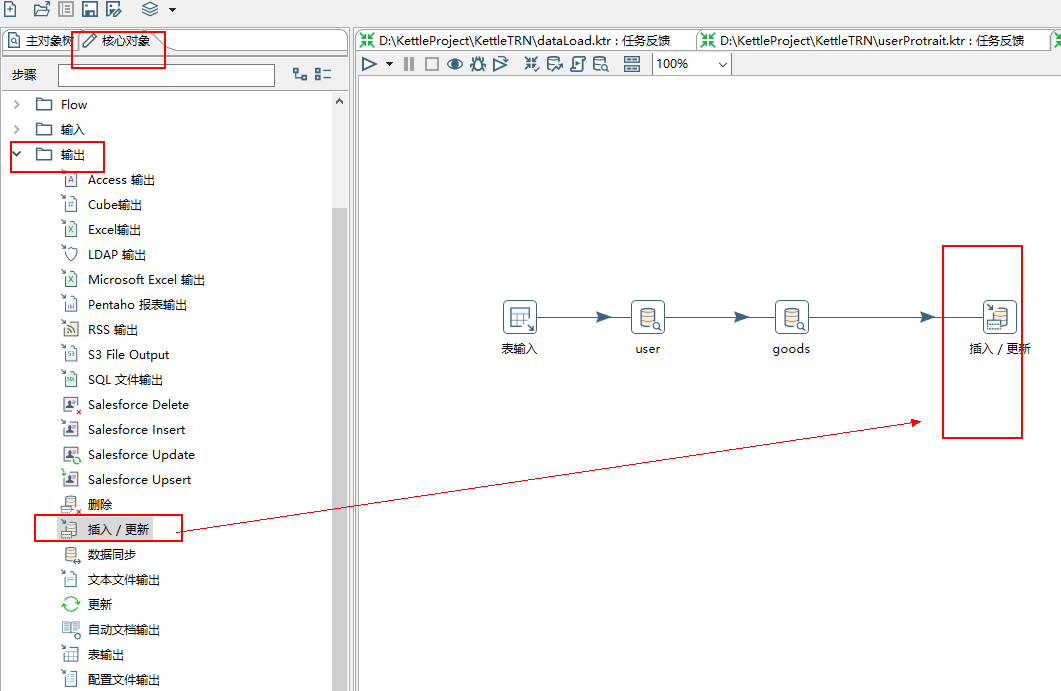 7、点击面板左侧的** 核心对象 ,选择 输出 ** 文件夹下的 ** 插入/更新 **,并把它拖到右侧的编辑区中,按住 shift 画线连接 “数据库查询”(goods),如下图。