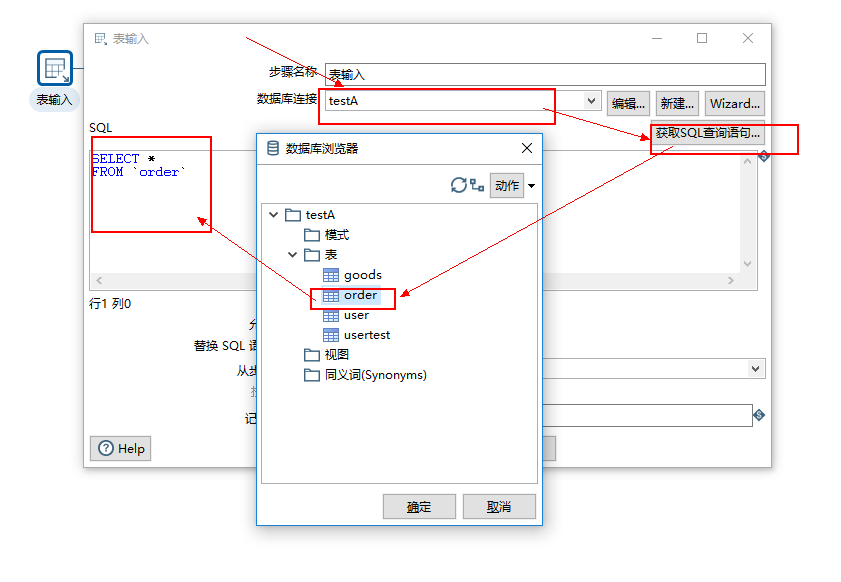 4、双击编辑区的“表输出”图标,编辑数据输入源。此处为多表联合查询,所以表输入我们配置的表为订单表(关联关系表)
