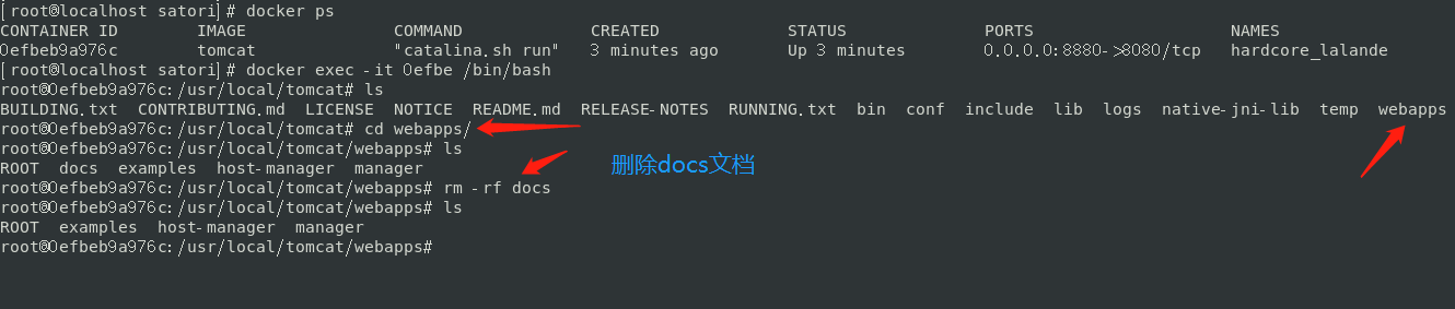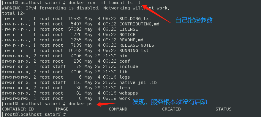 表示暴露端口为8080,然后执行CMD ["catalina.sh", "run"]。docker run -it tomcat之所以可以启动服务,输入localhost:8080还能看到那只猫,是因为最后一条命令。但是如果我们自己指定参数,那么会咋样呢