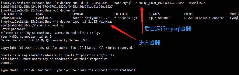 # 将12345端口映射到3306,指定name为mysql docker run -p 12345:3306 --name mysql # 设置mysql的初始密码 -e MYSQL_ROOT_PASSWORD=123456 # 后台运行mysql -d mysql:5.6