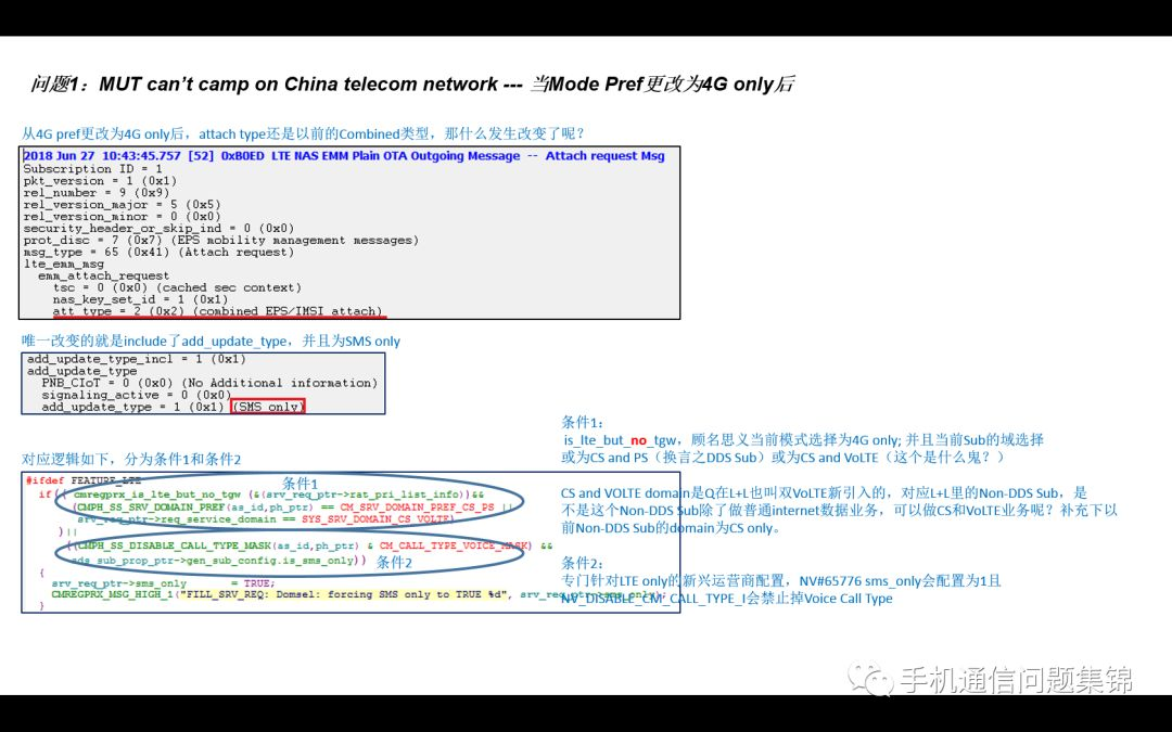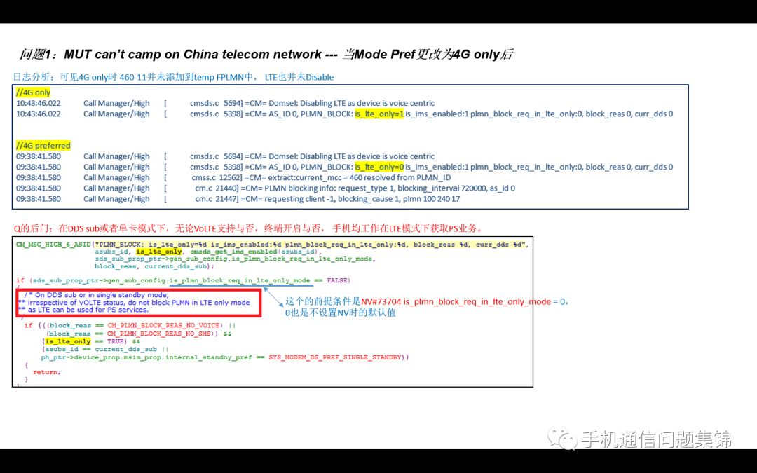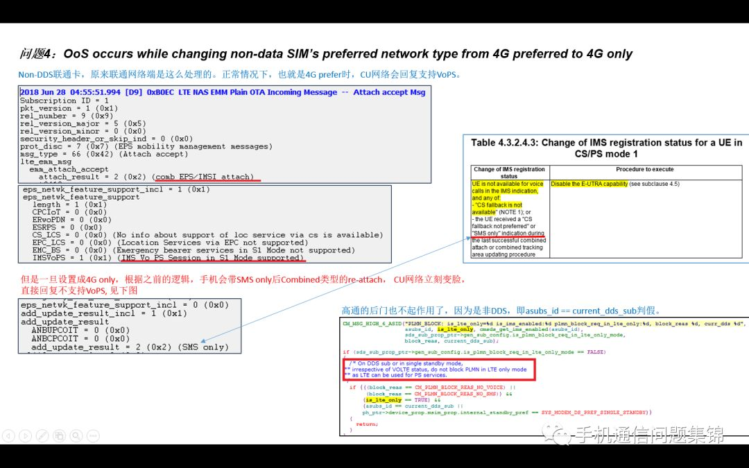 其实,之前讲过《4G强场下开机,为什么我的4G图标晃了一下就消失了?》,所以上面的四个问题都可以归结于此,因此舌战群儒,跟测试团队的各种解释,手机Work as design,结果意外地发现了Q司的一个改善用户体验的后门(被这个后门打了脸,Q司并没有按照协议去做) --- 当设置成4G only模式后,如果是单卡或者是DDS Sub,即使当前Voice not available,Voice Centric设备还会工作在LTE上进行PS业务,类似当成了一张数据卡使用。
