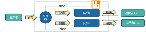 队列通过路由键(routing key,某种确定的规则)绑定到交换器,生产者将消息发布到交换器,交换器根据绑定的路由键将消息路由到特定队列,然后由订阅这个队列的消费者进行接收。
