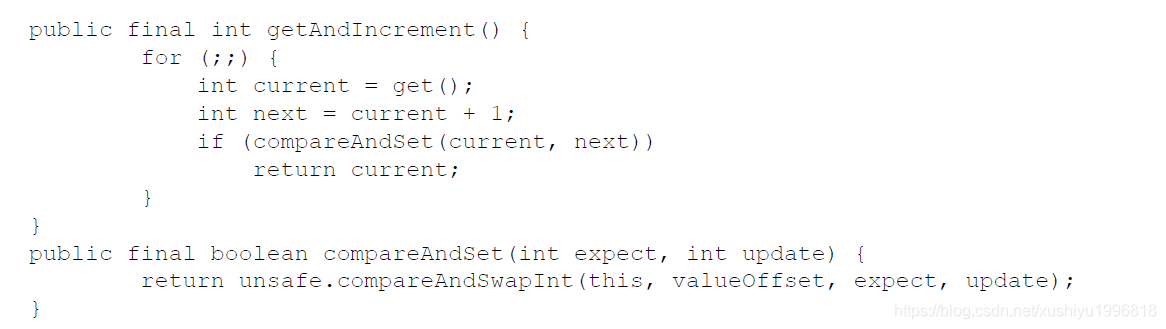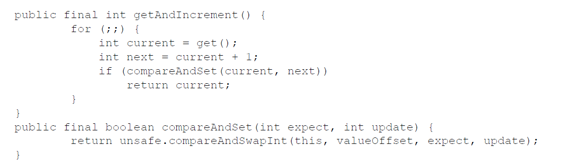 Atomic Integer的当前数值更新成next的值,如果不等compareAndSet方法会返回false, 程序会进 入for循环重新进行compareAndSet操作。