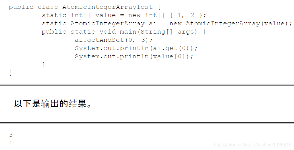 以上几个类提供的方法几乎一样,所以本节仅以Atomic Integer Array为例进行讲解, AtomiclntegerArray的使用实例代码如代码清单