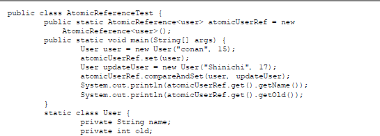 以上几个类提供的方法几乎一样,所以本节仅以AtomicReference为例进行讲解, AtomicReference的使用示例代码如代码清单