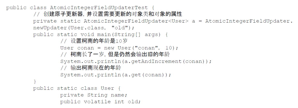 以上3个类提供的方法几乎一样,所以本节仅以AstomiclntegerFieldUpdater为例进行讲解, AstomiclntegerFieldUpdater的示例代码如代码清单