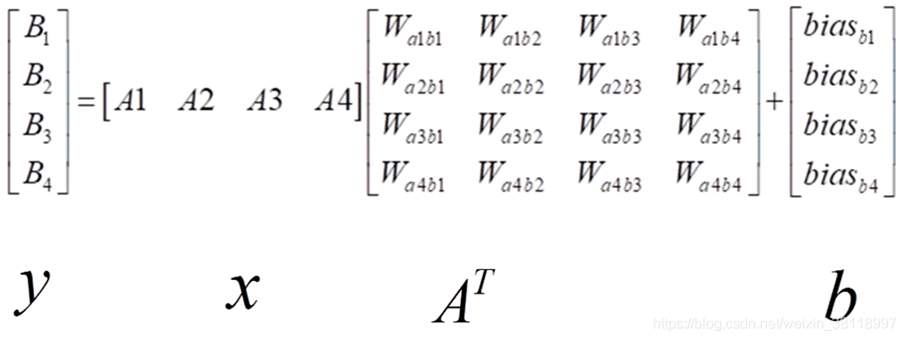 上述公式中虽然仅仅 我们能看出是矩阵表达,但实际上公式中的 , 和 均以矩阵形式存在,下面我们详细说说 上述网络结构是如何转换成矩阵计算并通过 torch.nn.Linear 函数计算的。首先,我们将上述网络结构中B1~B4的各层计算结果表达出来,结果如下: