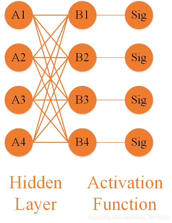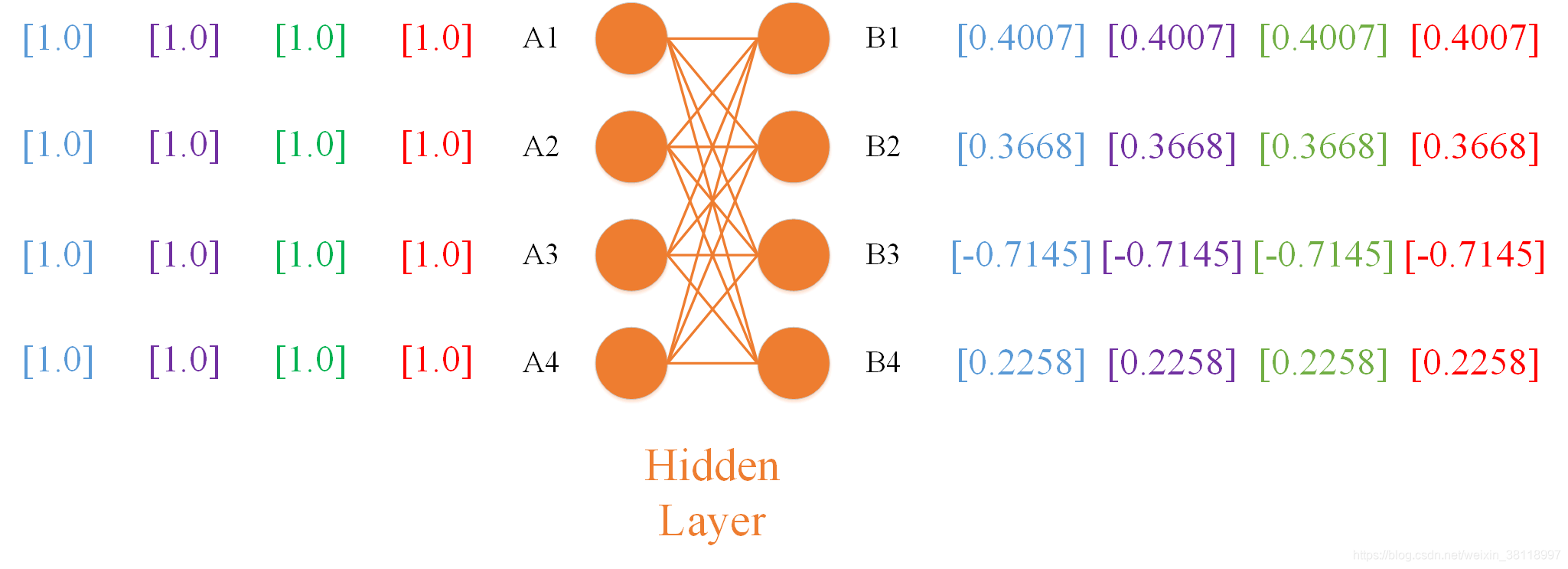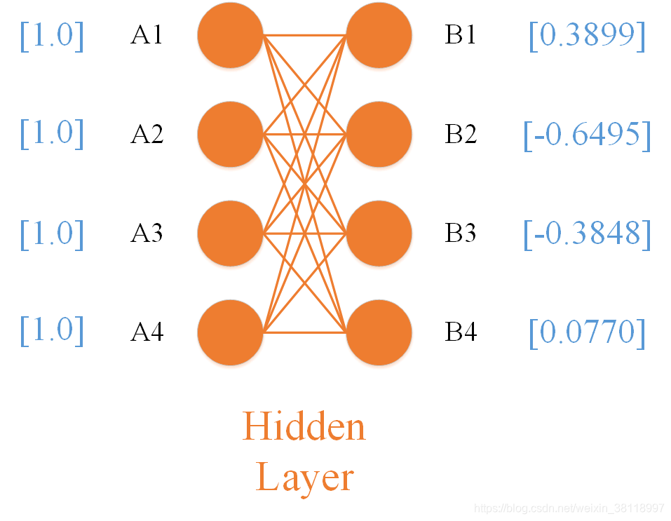上述定义参数中,第一个 4 表示A1~A4共有4个输入神经元,第二个4 表示B1~B4共有4个输出神经元,True表示神经元B1~B4默认带有偏置项。