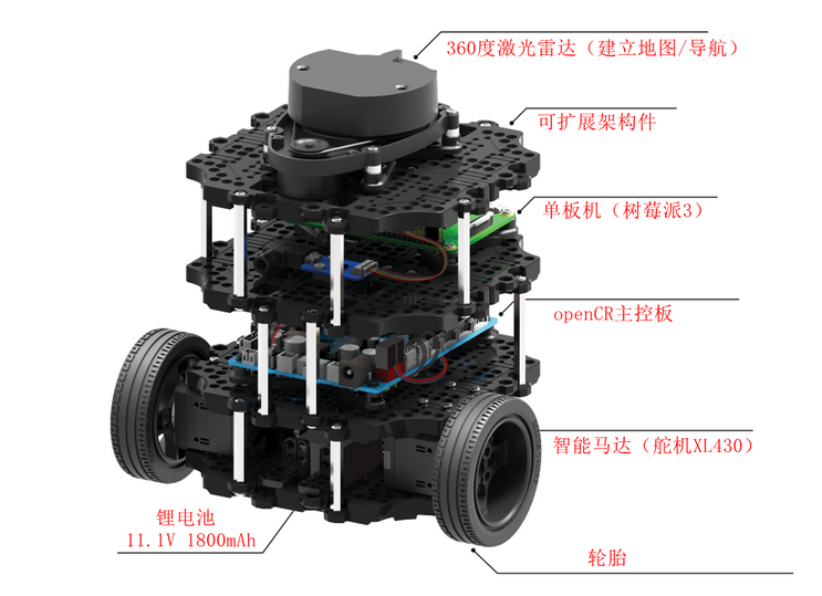 TurtleBot3有TurtleBot3 Burger、Waffle和Waffle Pi三种官方型号。目前waffle机器人目前由于intel Joule主控板停产,已经停产。TurtleBot3的基本组件有:用于驱动的舵机、用于运行ROS的SBC、用于SLAM和导航(Navigation)的传感器、可变形的结构件、用作中层控制器的嵌入式控制器OpenCR、兼容轮胎和履带的链轮,最后还有11.1V的锂聚合物电池。