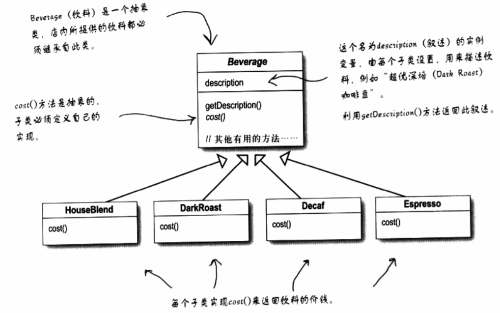 小星:没问题啊,您看啊,咱们有一个Beverage的抽象类,里面有getDescription()记录咖啡的描述,还有一个cost()的抽象方法来让子类计算价格。逻辑没问题啊,如果你想增加一种咖啡的话,直接增加子类不就好了吗?