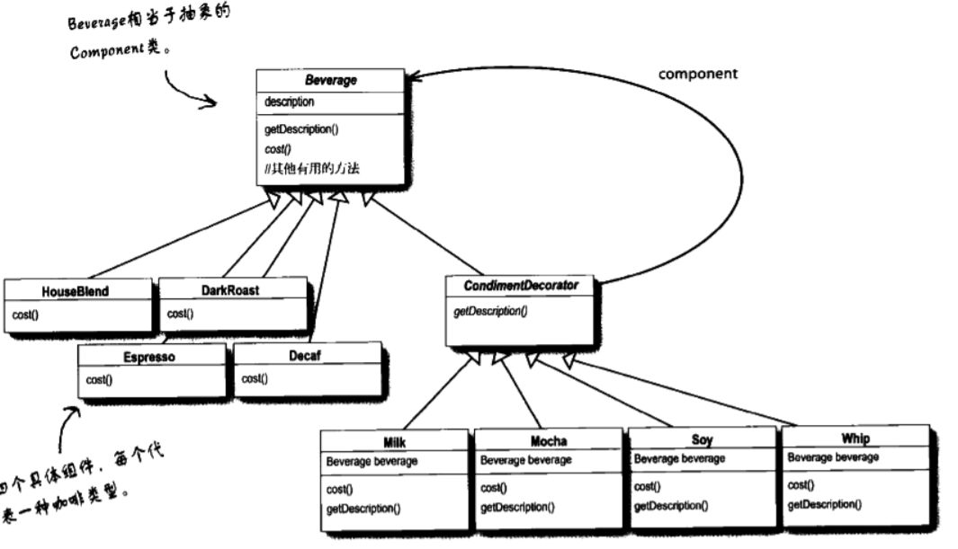 技术锦鲤:你可以创建一个CondimentDecrator的抽象类来继承Beverage,然后你其他所有的调料就都可以抽出来继承CondimentDecrator,这样你只需要选择好咖啡,然后再选择你需要的调料就行了,而且还可以添加多种调料。