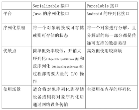 - 序列化实现的两种方式:实现 Serializable/Parcelable接口。不同点如图: