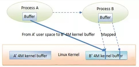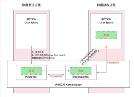 copyfromuser()将数据 copy 到内核中的内核缓存区,由于内核缓存区和接收进程的用户空间存在内存映射,因此也就相当于把数据发送到了接收进程的用户空间,这样便完成了一次进程间的通信。