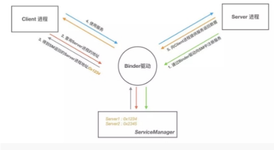 工作原理: 每个业务模块创建自己的 AIDL 接口并实现此接口,然后向服务端提供自己的唯一标识和其对应的 Binder 对象。服务端只需要一个 Service,服务器提供一个 queryBinder 接口,它会根据业务模块的特征来返回相应的 Binder 对象,不同的业务模块拿到所需的 Binder 对象后就可进行远程方法的调用了