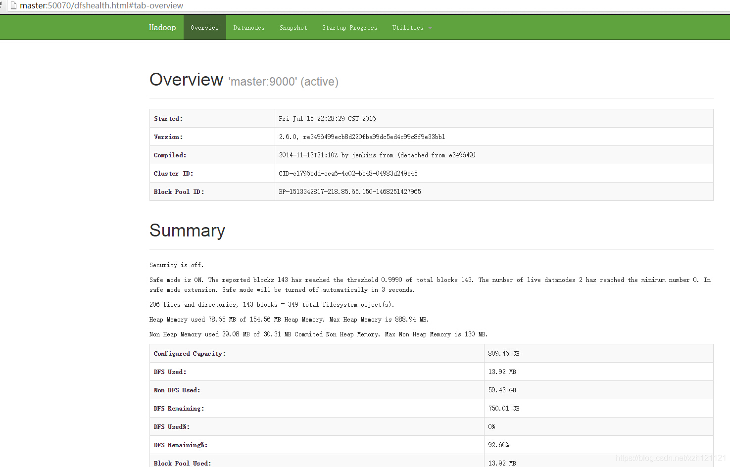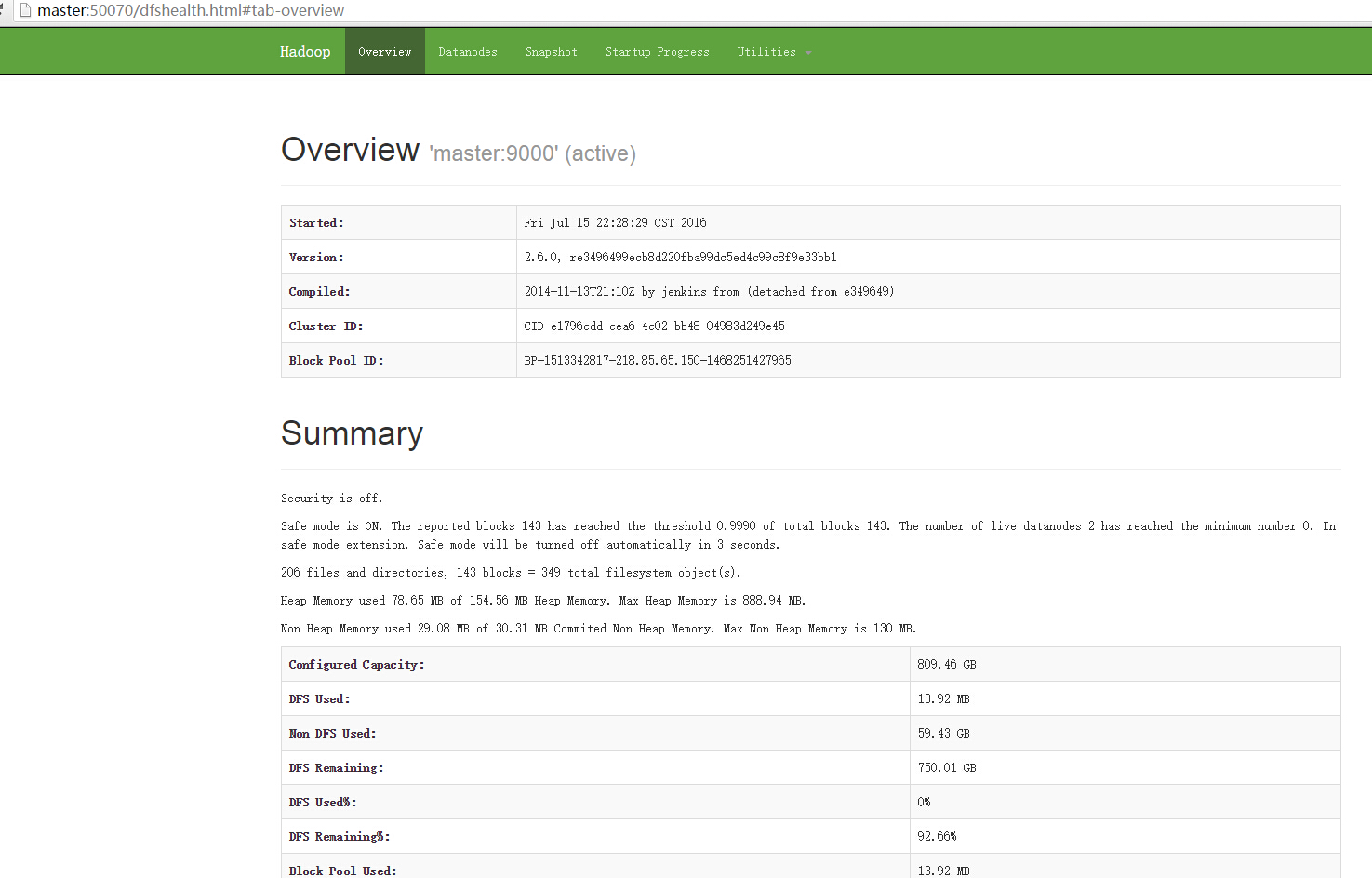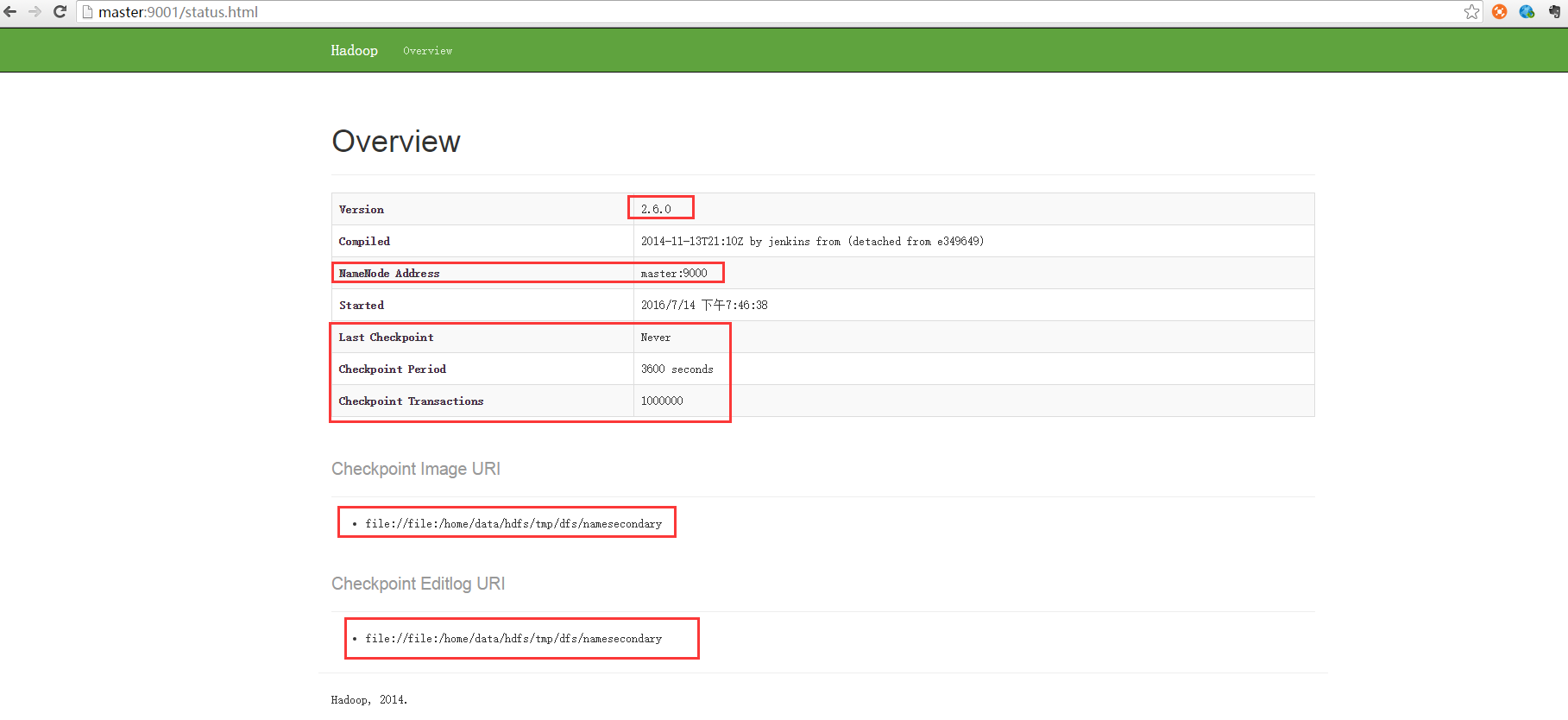 Secondary节点定期合并主Namenode的namespace image和edit log, 避免edit log过大,通过创建检查点checkpoint来合并。它会维护一个合并后的namespace image副本, 可用于在Namenode完全崩溃时恢复数据。下图为Secondary Namenode的管理界面: