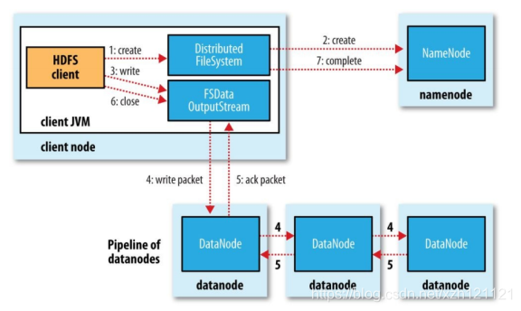 3)客户端写入数据的时候,DFSOutputStream分解为packets,并写入到一个数据队列中,该队列由DataStreamer消费。