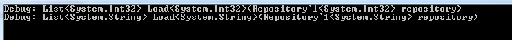 Console.WriteLine("Debug: List<{1}> Load<{1}>({0}<{1}> repository)", typeof(Repository<T>).Name, typeof(Repository<T>).GenericTypeArguments.First());