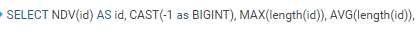 每次执行compute stats table就是给所有字段干了下面这个事,ndv类似distinct,只是不是准确值,预估,所有表越大,字段越多,compute stats时间越长