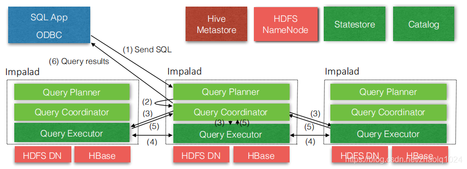 impala部署需要3个角色,impalad服务负责接受客户端请求并且分发查询段在集群间,并且执行单个查询段。jdbc连的impala节点会充当查询的coordinator角色,所有的impalad服务都是平等的,这样也提供了负载均衡和容错的可能