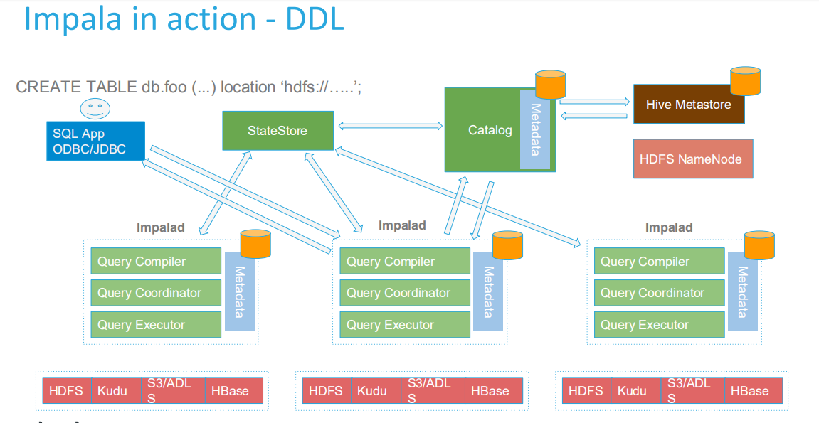 catalog角色作为元数据访问的gateway,通过catalog,impalad可能执行ddl操作将元数据分发到外部存储例如hive metastore