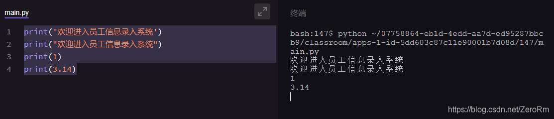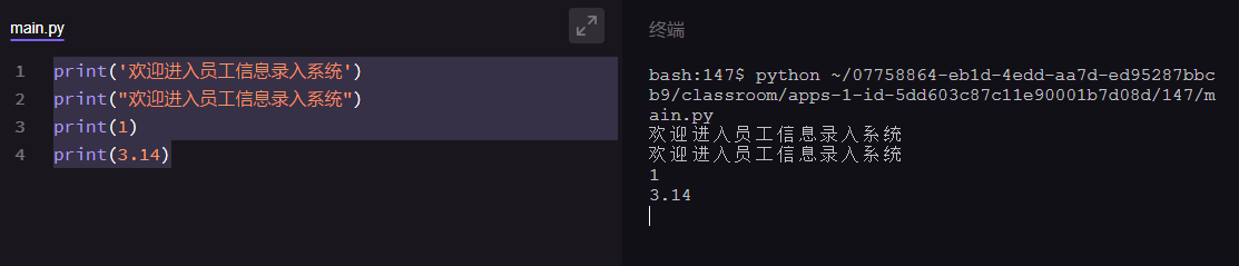 字符型 :print('欢迎进入员工信息录入系统') 或者 print("欢迎进入员工信息录入系统")