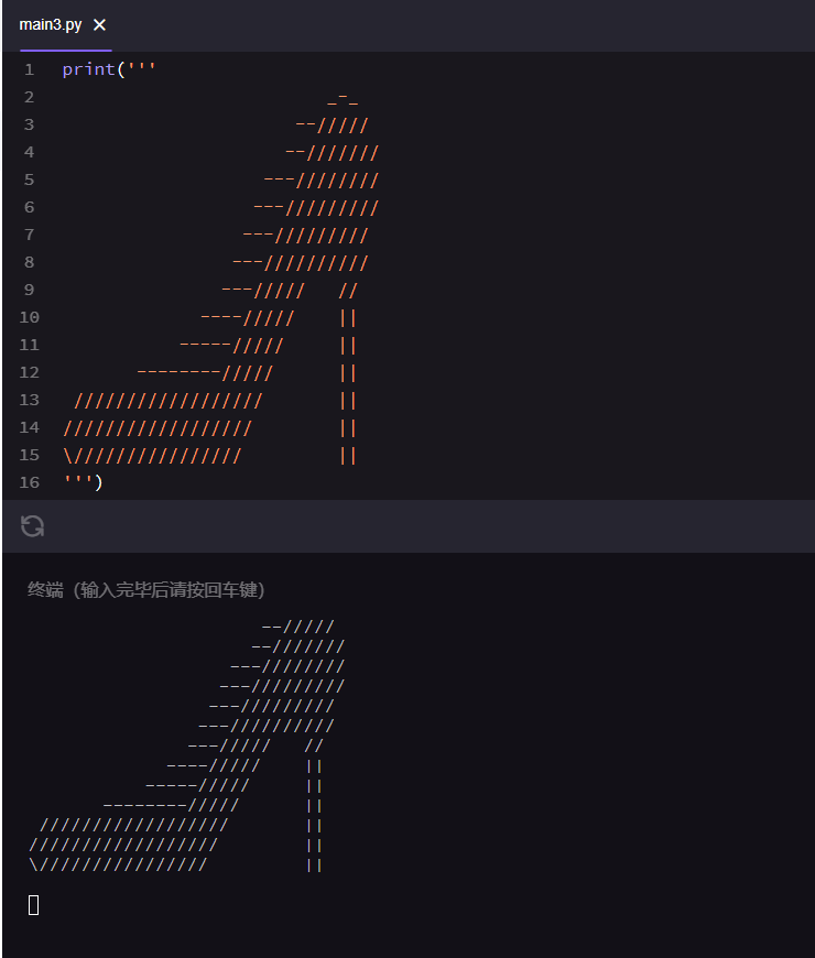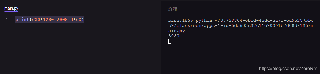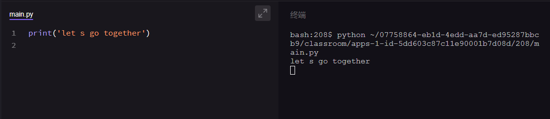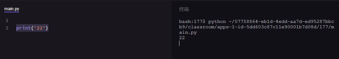 现在你试试在下面左边的代码框里输入你的年龄:【22】,再在右边的终端框点进运行。(提示:使用print()函数,在括号里直接输入数字22)
