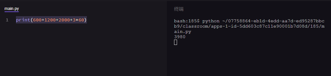 比如:我这个月买衣服花了600,吃饭花了1200,房租花了2000,还买了3盆花,每盆花60,我算一下啊。(代码如下:)