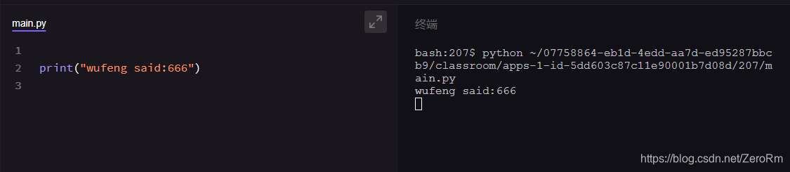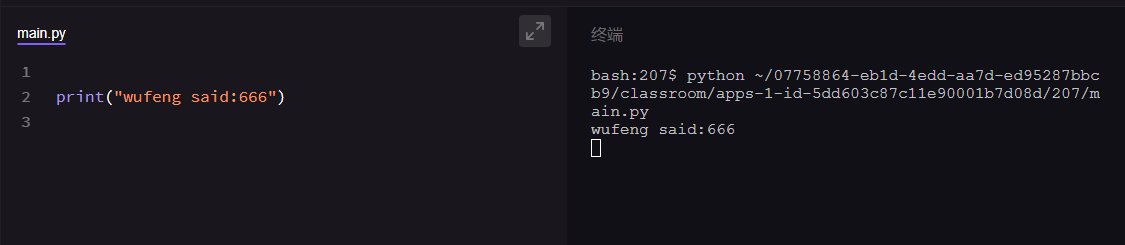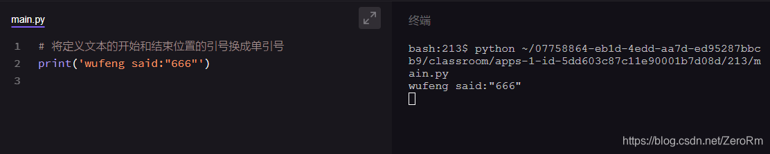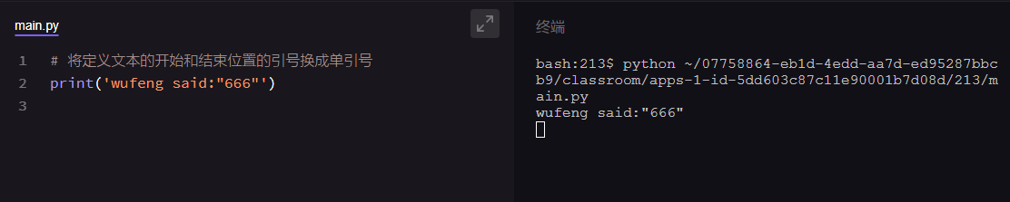现在,我把【print("吴枫 said:"666"")】里的定义文本位置的引号换成了单引号,变成了【print('吴枫 said:"666"')】,点进运行下,看看,是不是成功了。