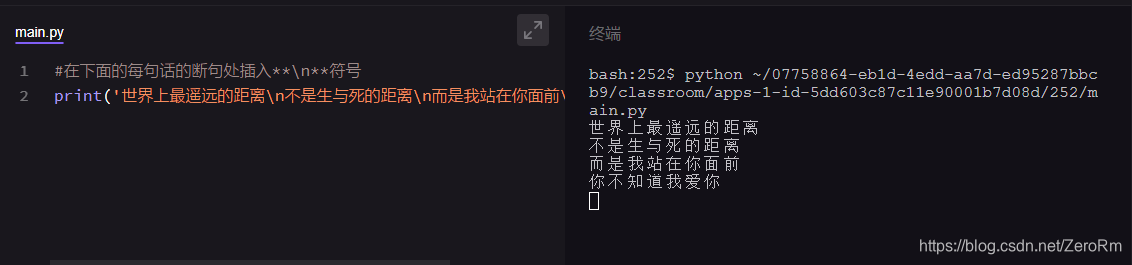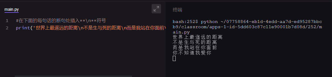 其实除了三引号之外,我们还可以借助其他符号实现这些功能:使用转义字符\n,我们想实现换行的位置,插入这个符号,就可以实现换行了,就像下面这样,点击运行即可。