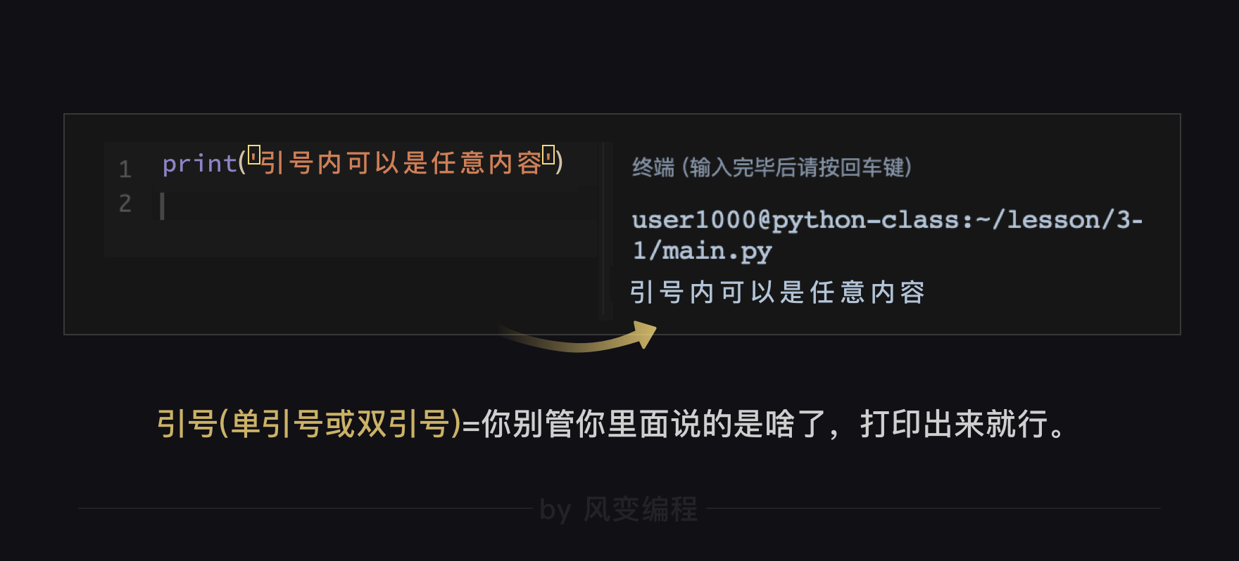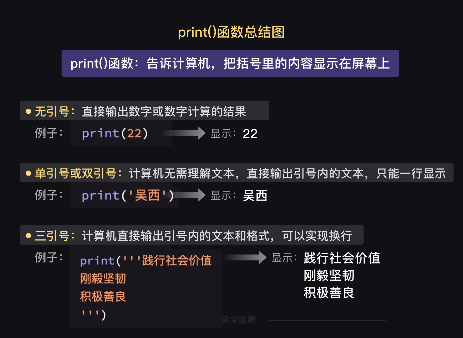 print()函数的四种情况--无引号,单引号,双引号,三引号。哥哥给你整理了一张总结图,记得回去要好好复习哦。