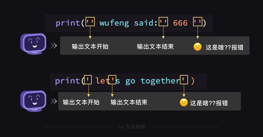 这两行英文文本里都出现了与括号的引号相同的引号。这两行代码都会报错的原因是:计算机是靠引号的开始和结束来定位要输出的文本的开始和结束的,如果文本里面也带了相同的引号,他无法识别要输出的文本的起点和终点,就会报错了。
