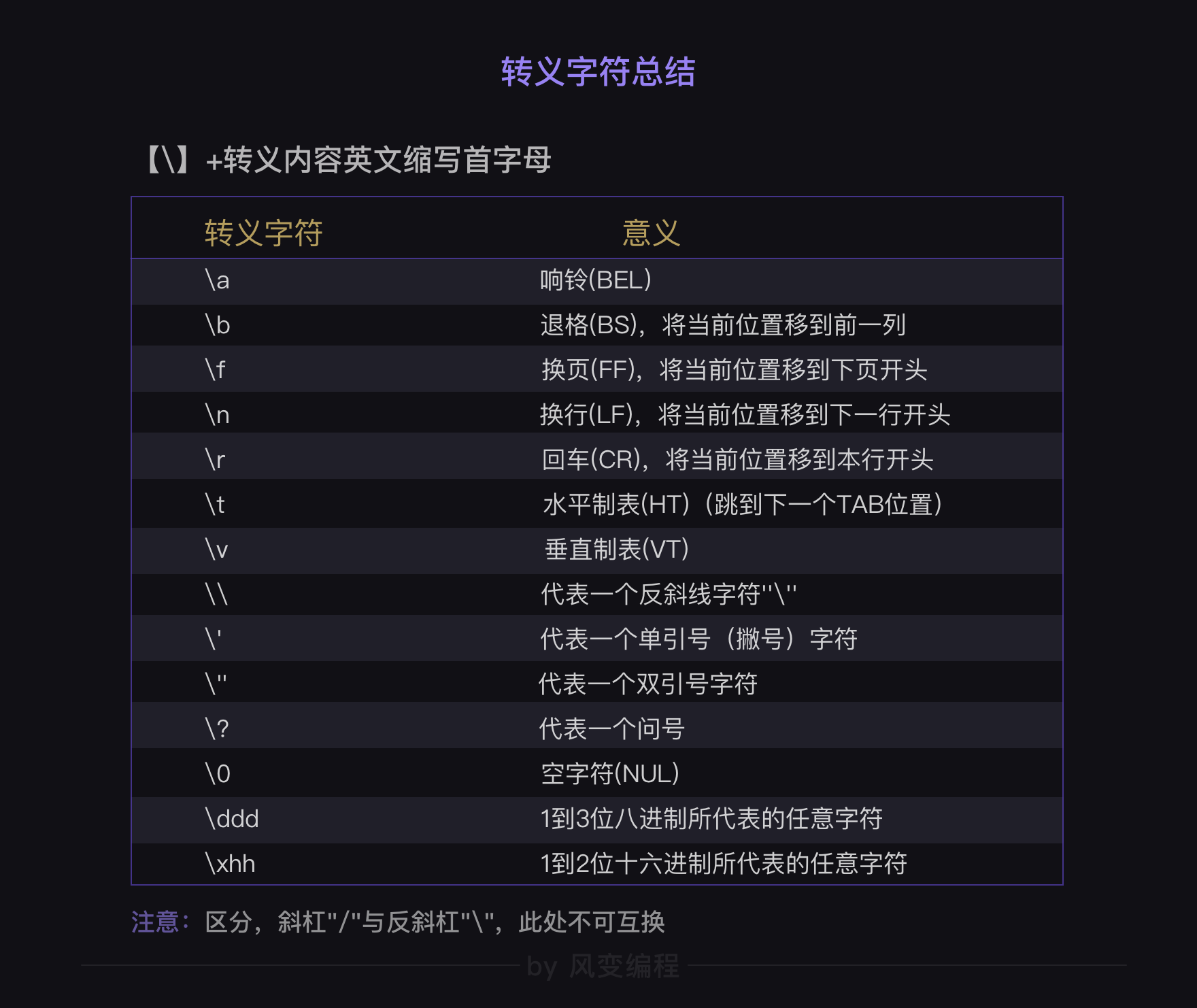 除了\n之外,转义字符还有很多,它们的特征就是:反斜杠+想要实现的转义功能首字母,这张图就总结的很全面。