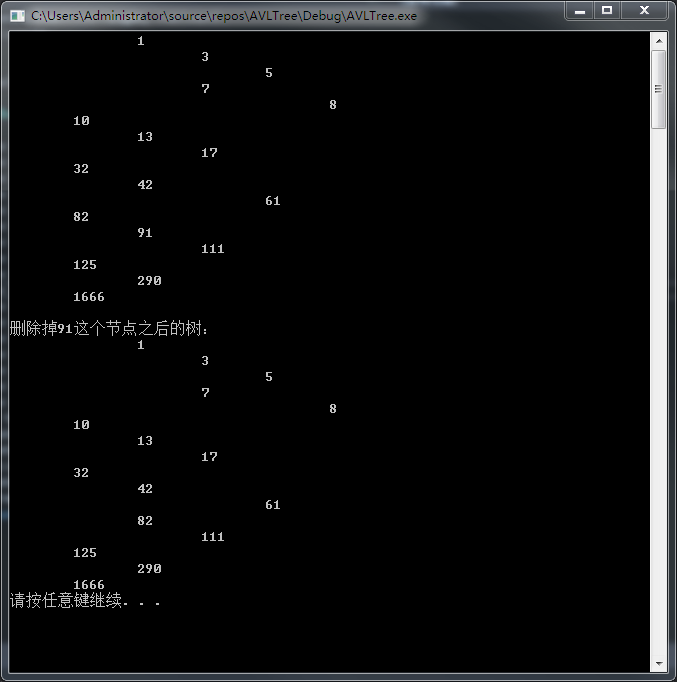 std::cout << std::endl << "删除掉91这个节点之后的树:"<< std::endl;