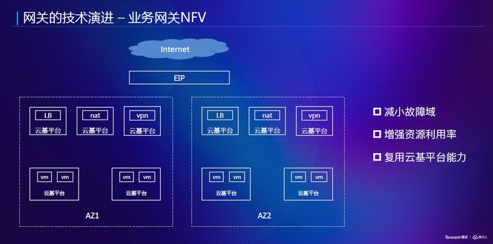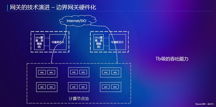 边界网关包含两种:公网与腾讯云内网的边界网关(如EIP网关);腾讯云不同地域间DCI的边界网关(如云联网网关),这两种网关必须要集中式解决。边界网关硬件化后,网关面临的问题是这样解决的: