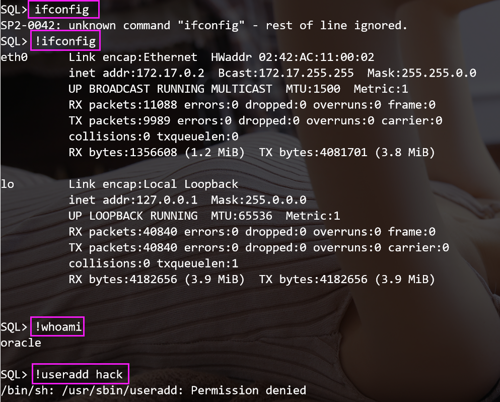 在系统命令前面加上!,但是因为Oracle 必须为非root用户, 所以很多命令可能无法执行。